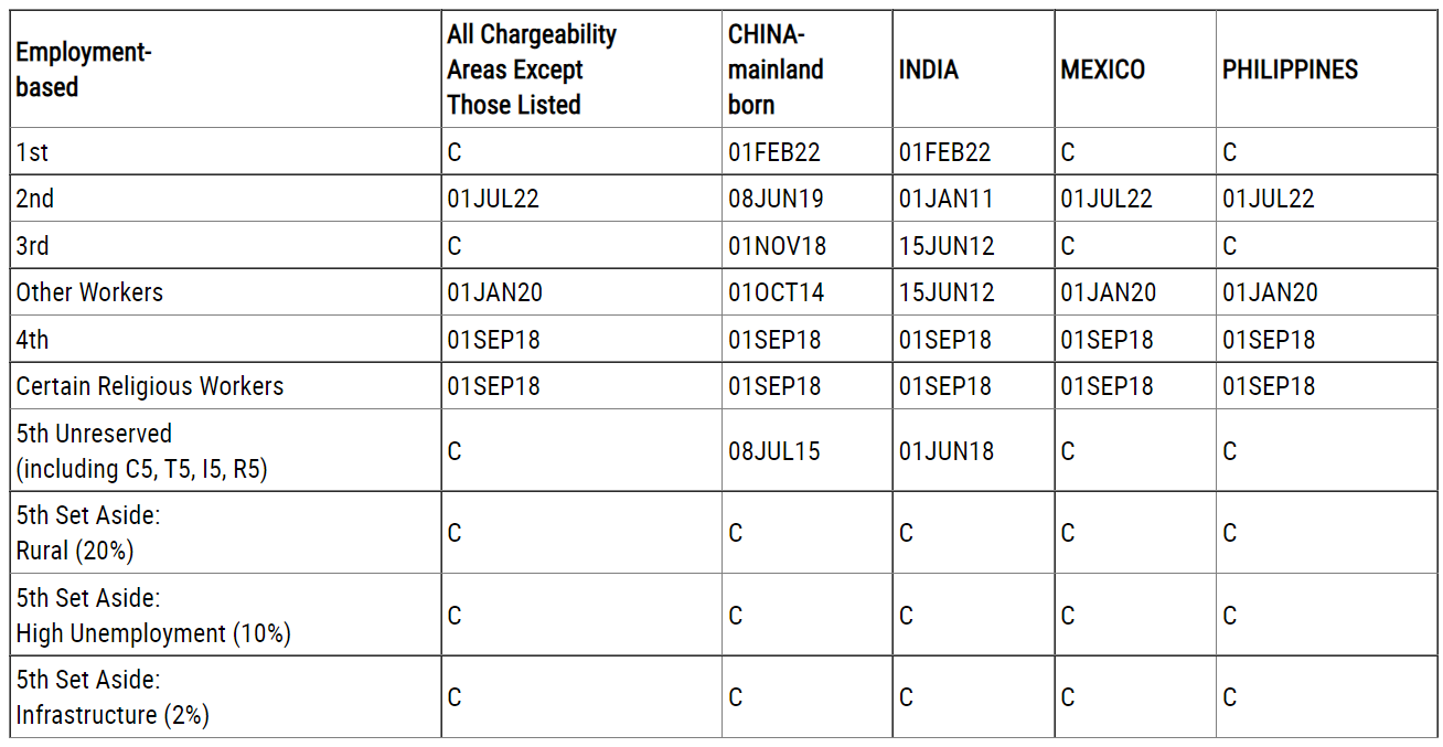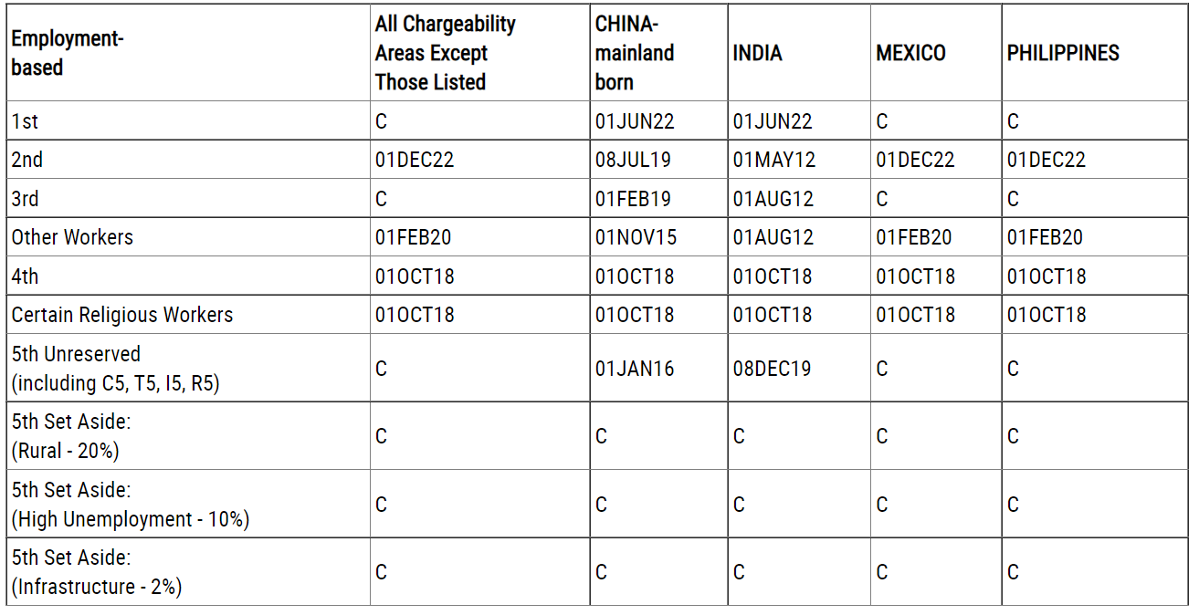 排期表中的“C”表示Current,是指该类别目前绿卡有名额,申请人可以继续调整身份。排期表中的“U”表示Unauthorized,是指该类别目前没有名额。