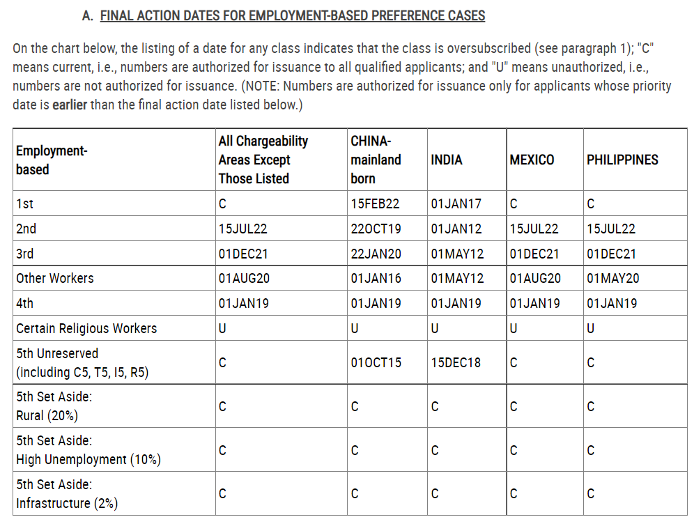 表A说明当申请人的优先日(Priority Date)早于排期表上的日期,将有资格得到美领馆面试安排或在美国递交I-485身份调整申请,并可裁决是否可获批绿卡或移民签证,即绿卡是否有名额。