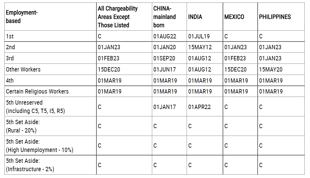 排期表中的“C”表示Current,是指该类别目前绿卡有名额,申请人可以继续调整身份。排期表中的“U”表示Unauthorized,是指该类别目前没有名额。