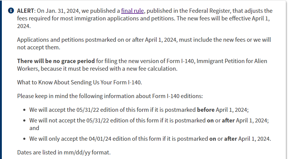 4月1日起签证申请费要涨价了,I140申请费由700美金涨到715美金。我一直认为移民局对职业移民EB1,EB2,EB3类别是真爱,700美金的申请费多年没变,这次普涨也只涨了2%。