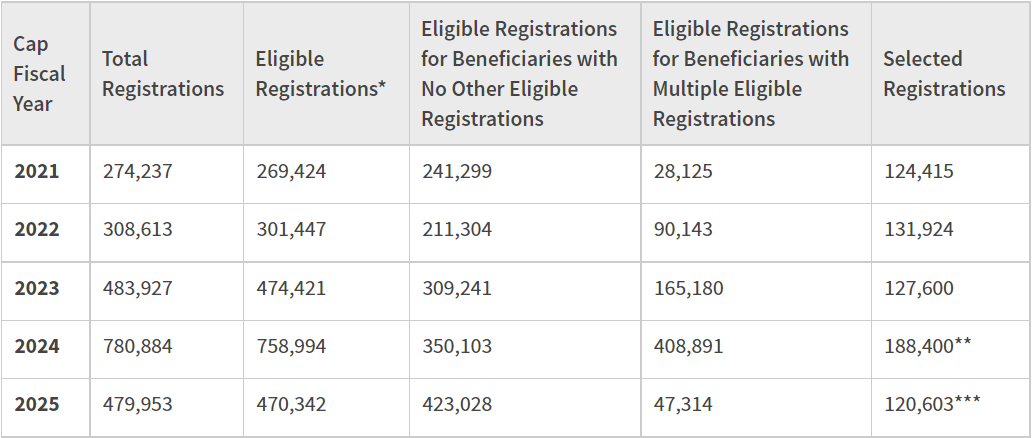 今年H-1B注册总数量为479,953份,其中有效注册470,342份,总中签数为120,603份,中签率约为25.64%。今年是一人一签第一年,有效注册大大减少,相对比较公平。去年H1B两轮抽签,我推测今年应该就一轮,没有海底捞了,看近5年中签数据除了2024财年都在12或13万,今年也在这个区间。2024年实在太混乱了,一人多抽太多,扰乱了正常的抽签秩序,所以不得不增加中签名额,这也是H1B改革的原因。