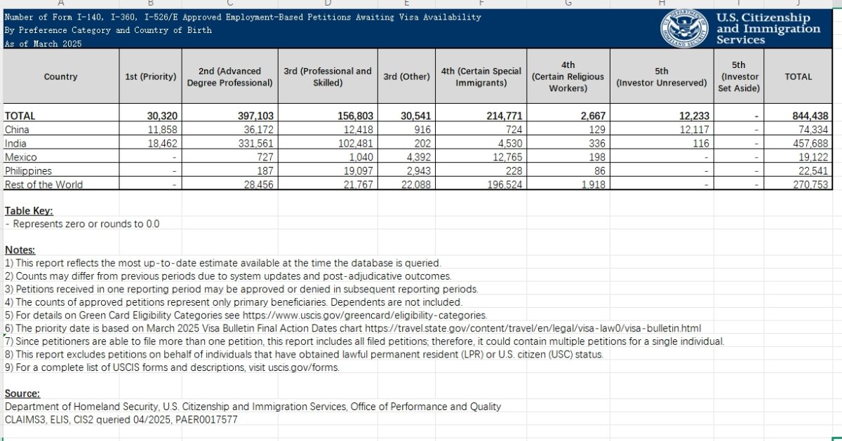 很明显除了EB5各类别排期人数都在上升,尤其是EB1大幅上升20%。中国申请人合计74334,印度申请人合计457688,在EB2和EB3类别他们优势太大了,美国雇主是真的喜欢印度人,无语。